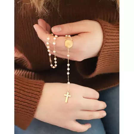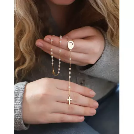 Ce bijou religieux représente à la fois la prière et l’objet accompagnant la récitation. En effet, le chapelet est fabriqué d’une façon bien particulière pour respecter les différentes prières. Il comprend 5 dizaines de perles : 5 séries de 10, séparées chacune d’une perle. Les séries de dix correspondent à « Je vous salue Marie » et les perles solitaires à « Gloire au Père ». L’extrémité du chapelet est accompagnée le plus souvent d’une croix et de 5 perles (3 perles entourées de 2 plus éloignées). La traduction est que la croix exprime « Je crois en Dieu » et le reste des perles à « Je vous salue Marie » et à « Notre Père ». Un vrai chapelet possède la séparation de ces perles et une croix en sa fin. Si ce n’est pas le cas, ce bijou religieux ne correspond pas aux prières et ne peut pas être utilisé pour la récitation.